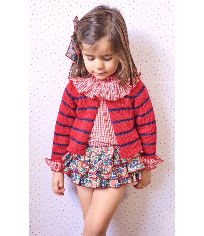 Conjunto niña de blusa vichy, braguita volantes flores y chaqueta 3/4 rayas BOUTIQUE LUNA de LA MARTINICA BY MARIA SOBRINO