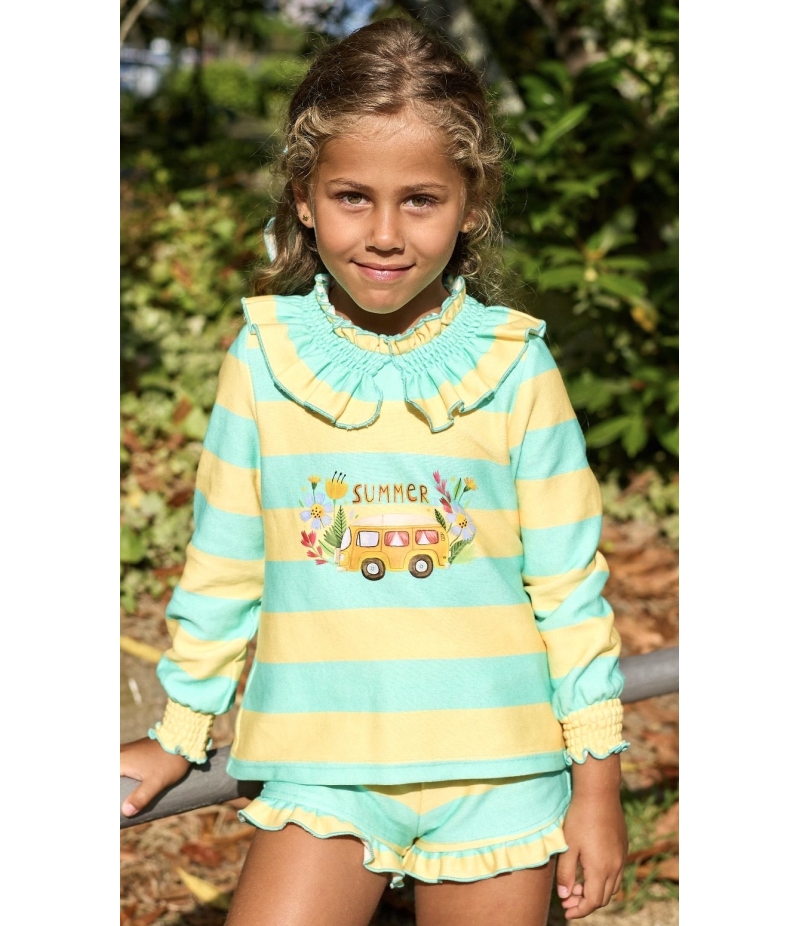 Conjunto niña de sudadera y short volantes en rayas verde y amariilo LA PROVENZA de LA MARTINICA BY MARIA SOBRINO