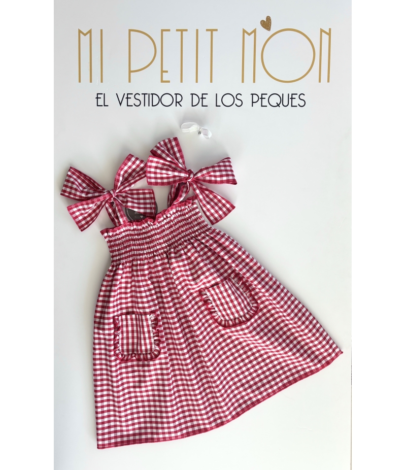 Vestido elástico con bolsillos en vichy rojo de MON PETIT BONBON